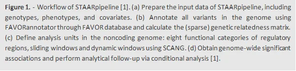 The STAARpipeline tools offer researchers a computationally efficient and robust RVs association-detection approach, which can be used for the automatic annotation of whole-genome/whole-exome sequencing (WGS/WES) studies and perform flexible noncoding and coding RV association analysis [1]. These tools include single variant, gene-centric coding, gene-centric noncoding, noncoding RNA (ncRNA), and sliding window tests for continuous or dichotomous outcomes [2], while further incorporating multiple functional annotations to empower RV (set) association analysis using the variant-set Test for Association using Annotation infoRmation (STAAR) [3] method. The main highlights of STAARpipeline compared to other GWAS tools are: