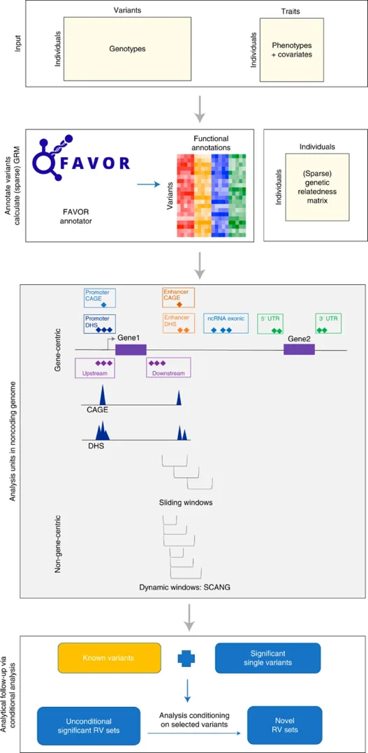 • Functional annotation of both noncoding and coding variants and creation of an annotated genotype dataset using the multi-faceted functional annotation database FAVOR [1, 4, 5].