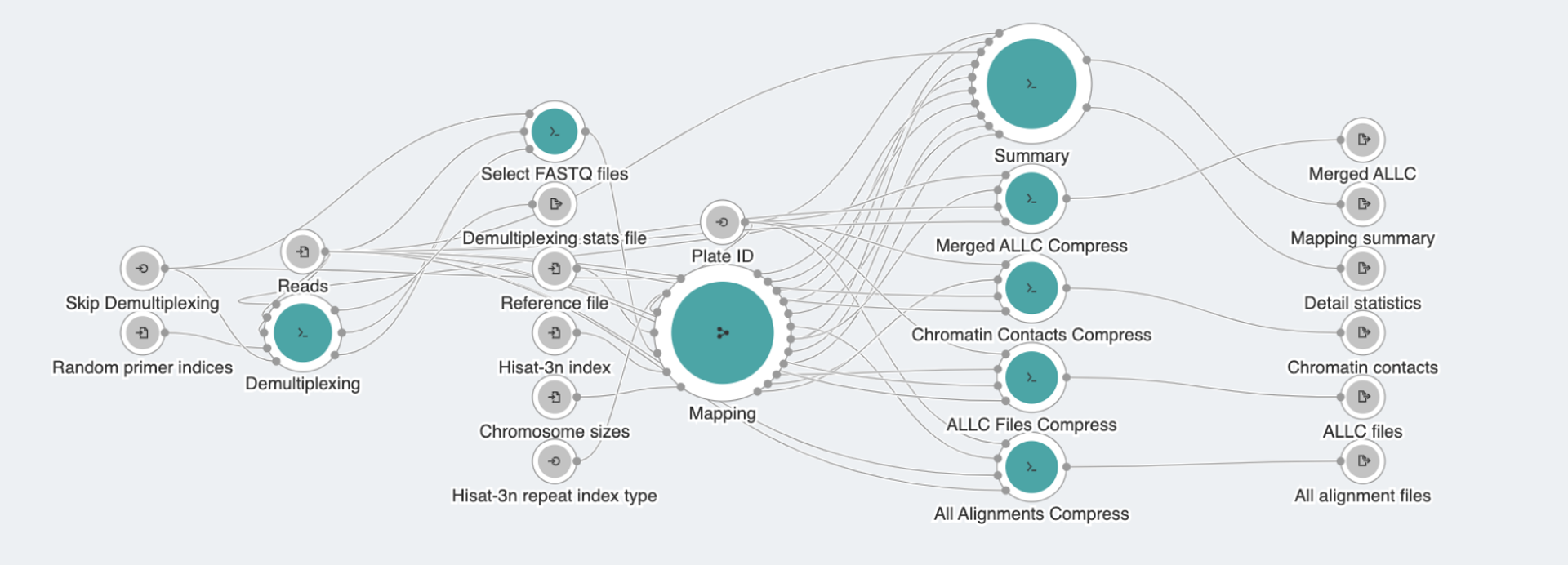 Figure 1. Overview of the snM3C pipeline available on the Velsera Seven Bridges platforms. The pipeline performs multi-cell reads’ demultiplexing, single cell reads’ mapping (including reads’ sorting, trimming, alignment, alignment files’ processing, calling chromatin contacts, and methylation extraction), and creating a summary report.